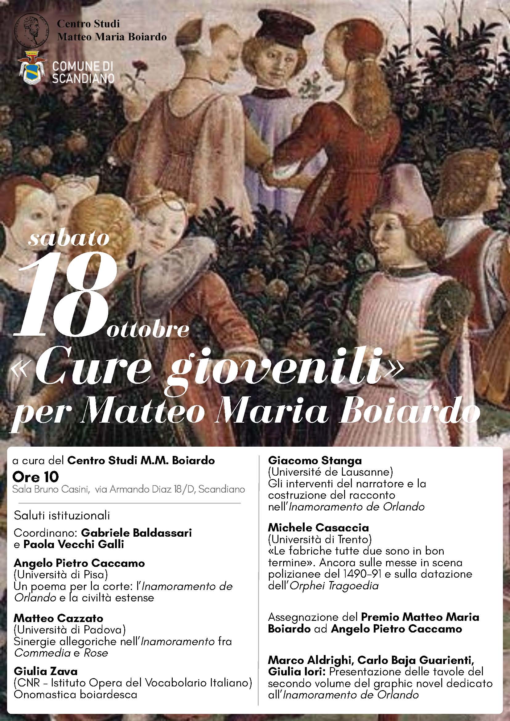 Cure giovenili» per Matteo Maria Boiardo a cura del Centro Studi "M. M. Boiardo" ore 10:00 sabato 18 ottobre 2025 Sala Bruno Casini Via Diaz 18/b Scandiano Saluti istituzionali Coordinano: Gabriele Baldassarri e Paola Vecchi Galli Angelo Pietro Caccamo (Università di...